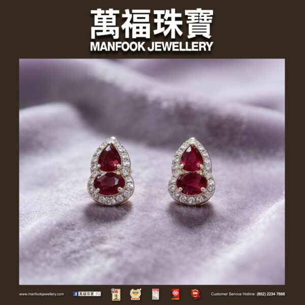 Pigeon blood ruby forms the outline of a gourd, while scattered diamonds outline its gentle curves. The red hue blends softly around the ear, revealing an elegant and ingenious Eastern design within its small space.