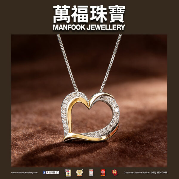 This 18K two-tone gold necklace features a heart-shaped design and is adorned with multiple dazzling diamonds that complement the yellow gold, giving the wearer a charming and elegant look.