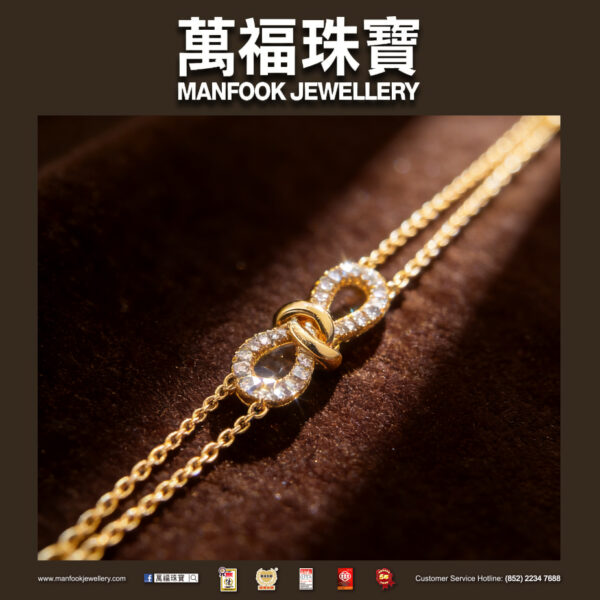 The yellow gold bracelet, shaped like a bow, has beautiful lines and is set with multiple sparkling diamonds, creating a stunning and dazzling light.