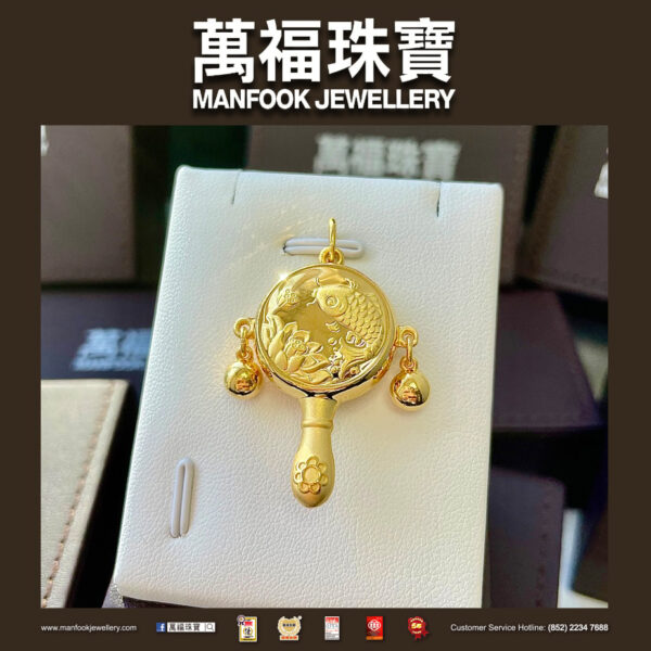 以傳統的撥浪鼓為造型的足金吊墜,運用精巧工藝雕琢而成,表面更刻有荷花鯉魚,寓意著年年有餘、財源滾滾,讓人愛不釋手。