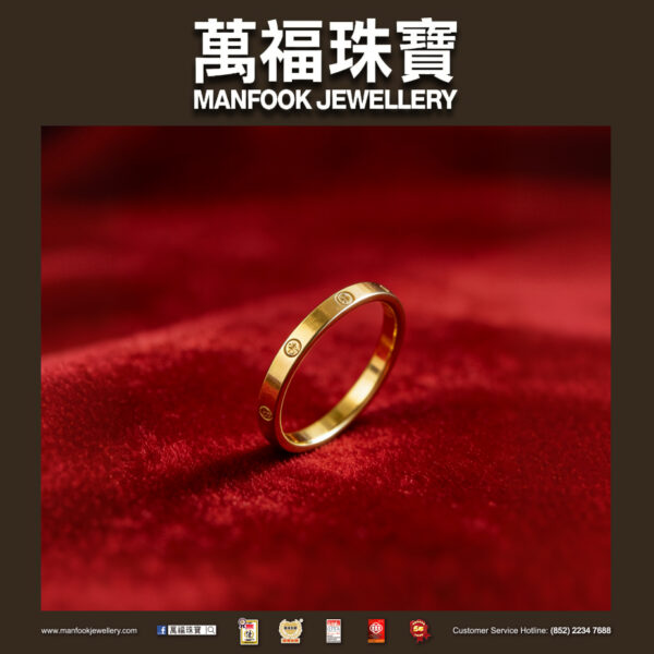 光面金戒的弧面流淌著暖調金澤,環身的細碎印記藏著專屬標識,利落素圈適配日常穿搭,指尖的溫潤觸感漾起雅致氛圍感,簡約造型也能承載長久陪伴的心意。