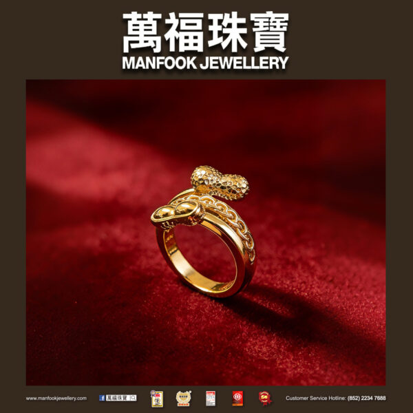亮澤金身雕琢雙花生造型,錘紋肌理勾勒飽滿細節,戒身鏈紋藏住精巧心思,承載生生如意的美好祈願,於指間綻放低調奢華的獨特韻致。