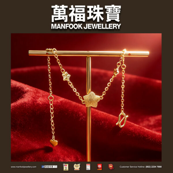 這條足金手鏈綴著星星裝飾,大顆星形紋理帶著細膩光澤,一側的心形掛飾添了點甜美,細節里的巧思讓整體更顯靈動,搭休閒裝或輕熟風穿搭都能襯出甜美的精緻感。