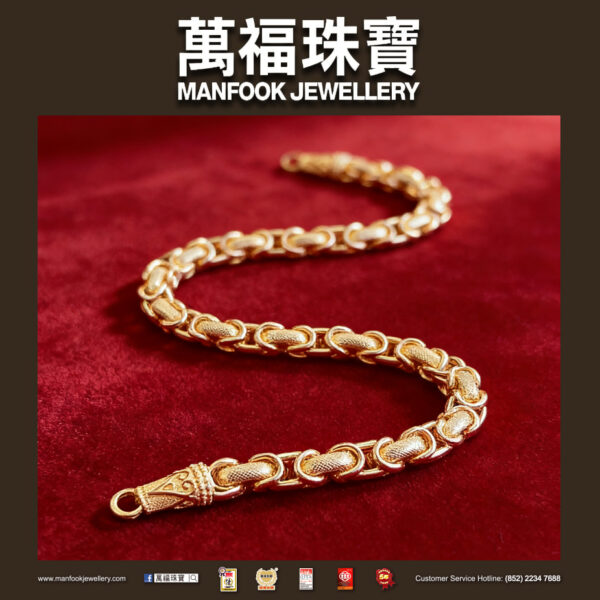 造型時尚獨特的一款足金手鏈,以多重工藝打造而成,讓佩戴者展現出時尚迷人的氣質,令人一目傾心。