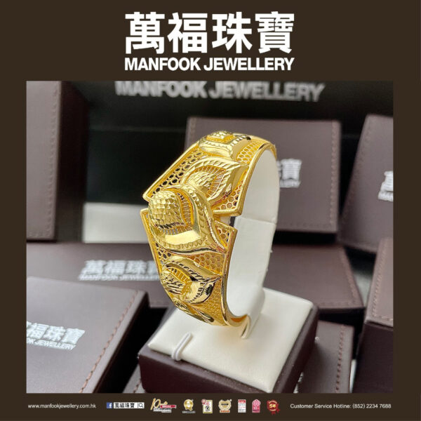 這款足金手鐲,運用了鏤空的工藝,配以獨特的圖案,營造出典雅大氣的迷人風格,讓佩戴者成為萬眾觸目的焦點。