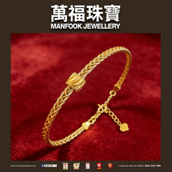 編絲手鐲扭繞出金絲的柔韌肌理,花絲編織的紋路嵌著鏨刻的精巧,卡扣處的立體裝飾揉進手工雕琢的細節,腕間金弧的弧度藏著東方金飾的雅致質感。