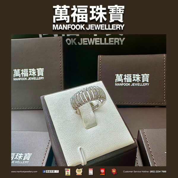 設計獨特的一款18K白色金戒指,鑲嵌著滿滿的耀眼閃鑽,在光線之下散發出迷人的光芒,令佩戴者透露出時尚優雅的氣質。