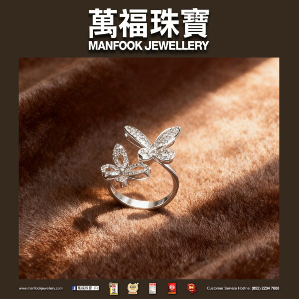 雙蝶錯落的銀戒裹著細密鑽光,襯出靈動形態,指尖輕戴便漾開柔亮光澤,是日常里藏著甜潤精緻的小飾物。