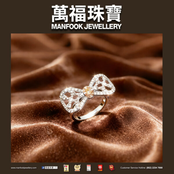 造型優美獨特的一款18K白色金戒指,以蝴蝶結為設計靈感,配以滿滿的璀璨閃鑽,襯托出中間的大顆黃鑽,讓人一見傾心。