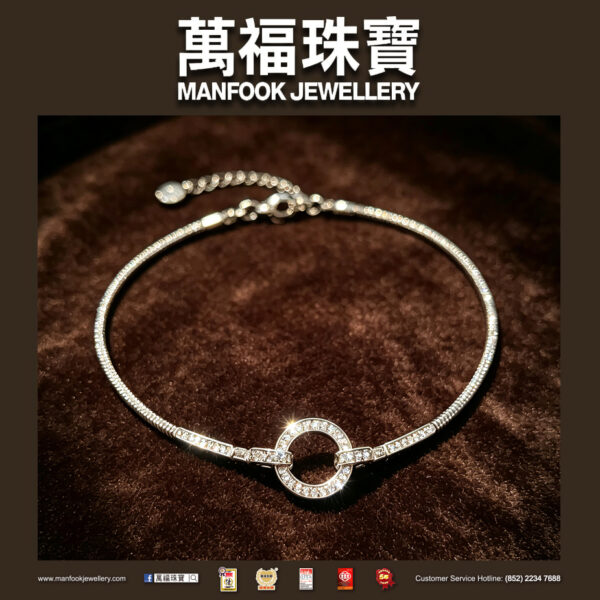 簡約的設計,加以多顆閃鑽的襯托,令手鏈閃耀出璀璨光輝,配以18K白色金的清秀高雅,讓人一眼傾心。