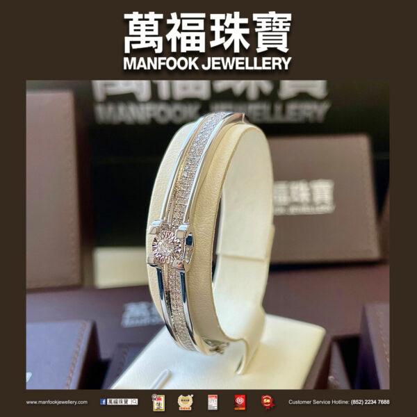 這款18K白色金手鐲,鑲嵌著滿滿的閃亮美鑽,在光線的折射下散發出耀眼的光芒,讓人一見傾心。