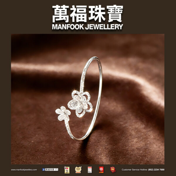 18K白金鐲身靈動開口,梅花錯落點綴藏著腕間溫柔心意,細密碎鑽鋪鑲折射鑽面細碎星芒,柔潤金屬貼合腕間弧度,漾起日常精緻氛圍感,承載專屬幸運期許。