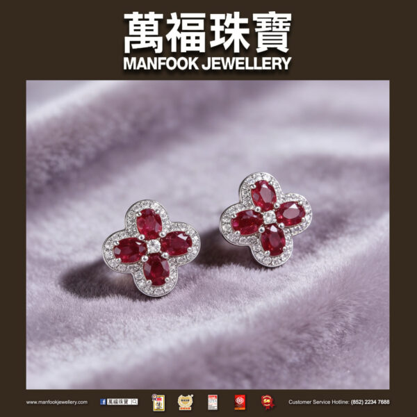 緋紅寶石雕琢出四葉的幸運輪廓,碎鑽繞邊暈開細碎的光,凝於方寸的璀璨,是耳畔輕綴的浪漫,也是不動聲色的偏愛。