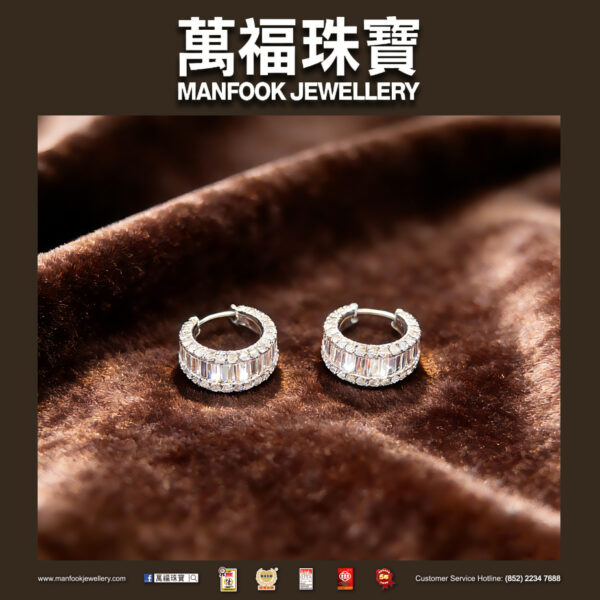 以時尚造型打造的一款18K白色金耳環,上面鑲滿了多顆閃亮美鑽,散發出醉人眼目的光芒,令佩戴者展現出新穎雅麗的迷人氣質。