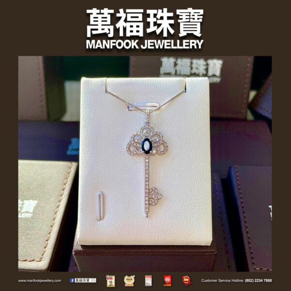 這款以鑰匙來設計的18K白色金項鏈,配以中間大顆的藍寶石,四周更是鑲嵌著滿滿的閃亮美鑽,在光線之下散發出醉人的光彩,令人目不暇給。