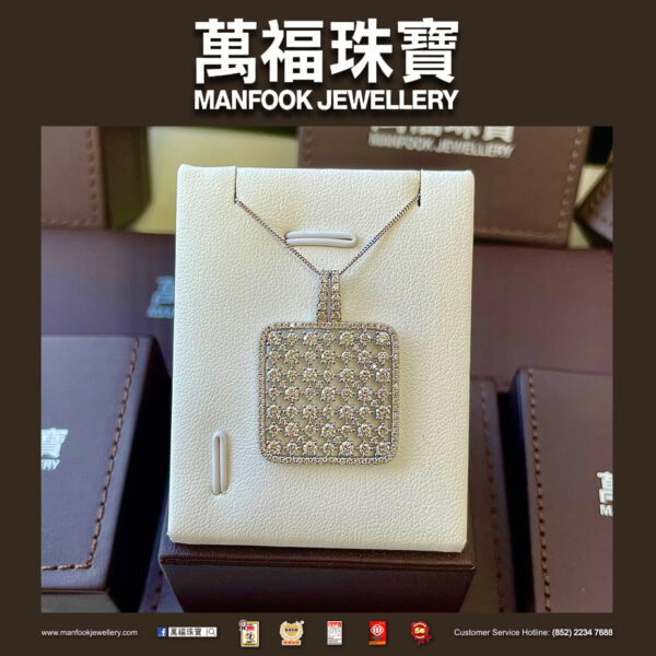 以方形為基礎的一款18K白色金項鏈,鑲嵌著滿滿的閃亮美鑽,在光線的折射下散發出耀眼的光芒,讓人目不暇給。