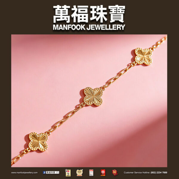 這款18K黃色金手鏈,以四葉草為造型,配以獨特的工藝,令表面散發出璀璨耀眼的光芒,再以纖細的鏈子串連,整體透露著秀麗的氣質。
